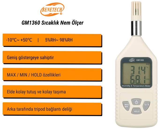 Benetech GM1360 sıcaklık ve nem ölçer cihazı; hassas, güvenilir, düşük güç harcayan, portatif sıcaklık ve nem ölçer cihazdır.