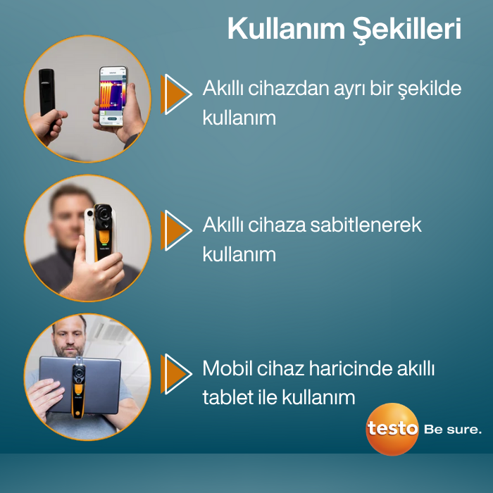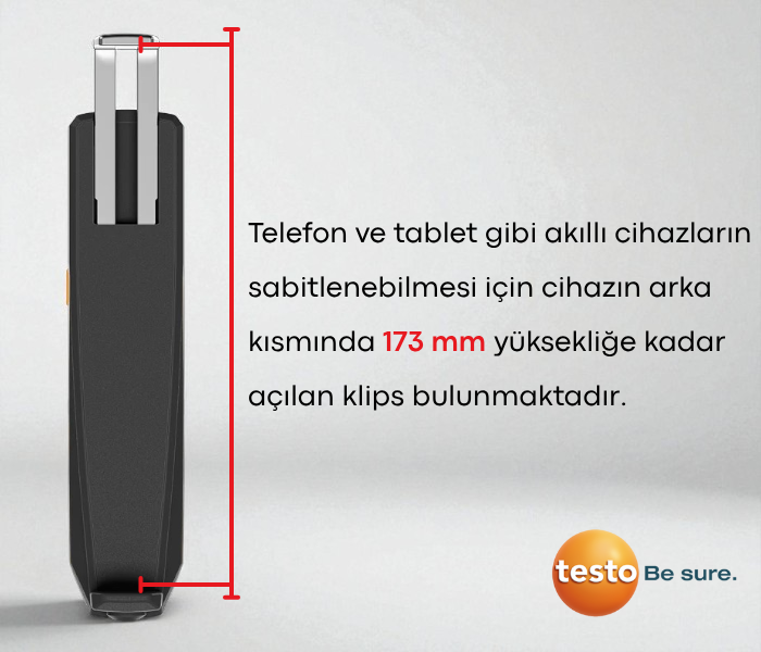 - Testo 860i doğrudan akıllı telefona klipslenebilir ya da bağımsız olarak kablosuz kullanılabilir. Tek elle kullanım ergonomisiyle pratik çalışma imkanı sunar.