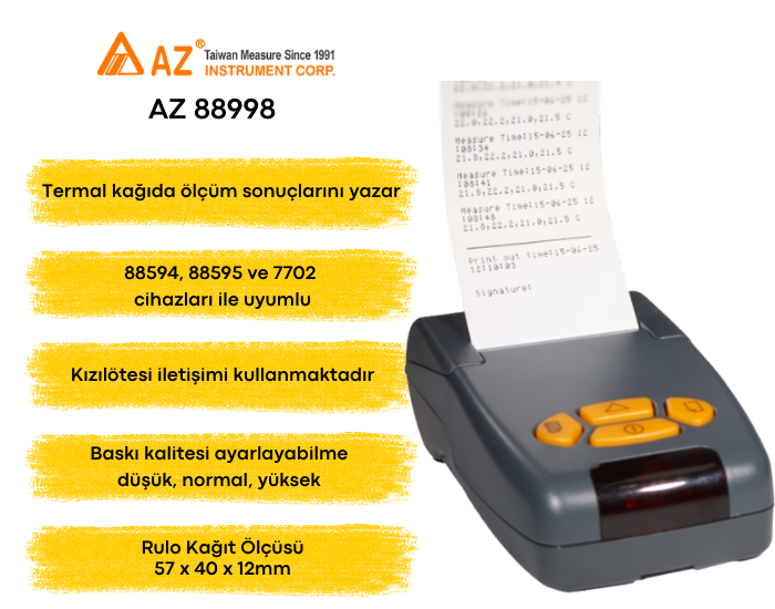 AZ 88998 termal yazıcı; ölçüm verilerinin sahada ya da laboratuvar ortamında anında dökümünü almak için tasarlanmış ekonomik fiyatlı bir yazdırma çözümüdür.