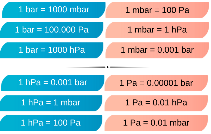 1 hPa = 1 mbar / 0,1 hPa = 10 Pa / 0.01 mbar = 0.001 Pa / 2 psi = 13789 pa