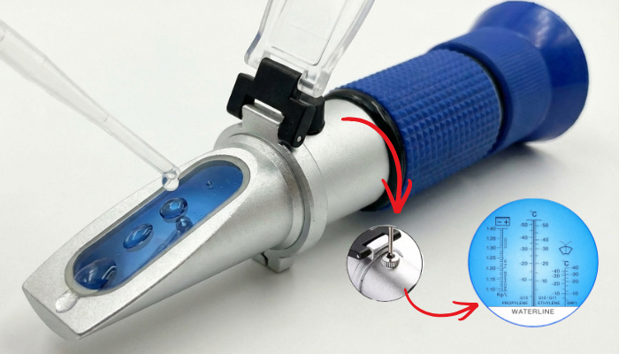Refraktometrenin prizmasına 2–3 damla distile su damlatın ve kapağı kapatın. Cihazı bir ışık kaynağına doğru tutarak mercekten bakın ve kalibrasyon vidasını ayarlayarak mavi ve beyaz alanın sınır çizgisini 0 çizgisi ile hizalayın.