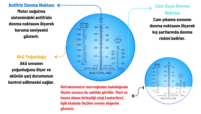 Refraktometreler, sıvıların içinden geçen ışığın kırılma miktarını ölçerek çalışır. Bir sıvı prizma üzerine damlatıldığında ışık sıvıdan geçerken kırılır ve bu kırılma miktarı sıvının yoğunluğuna bağlı olarak değişir. Cihaz içindeki skala bu kırılma değerini göstererek antifriz donma noktası, cam suyu donma noktası veya akü elektroliti yoğunluğunun hızlı şekilde belirlenmesini sağlar.