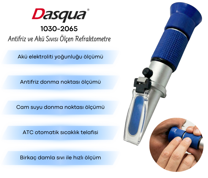 Dasqua 1030-2065 refraktometre, antifriz donma noktası ve akü elektroliti yoğunluğu ölçümü için kullanılan hassas bir optik ölçüm cihazıdır. Etilen glikol ve propilen glikol bazlı antifrizlerin yanı sıra cam suyu gibi temizleme sıvılarının kontrolünde de kullanılabilir ve ATC otomatik sıcaklık telafisi sayesinde güvenilir ölçüm sonuçları sunar.