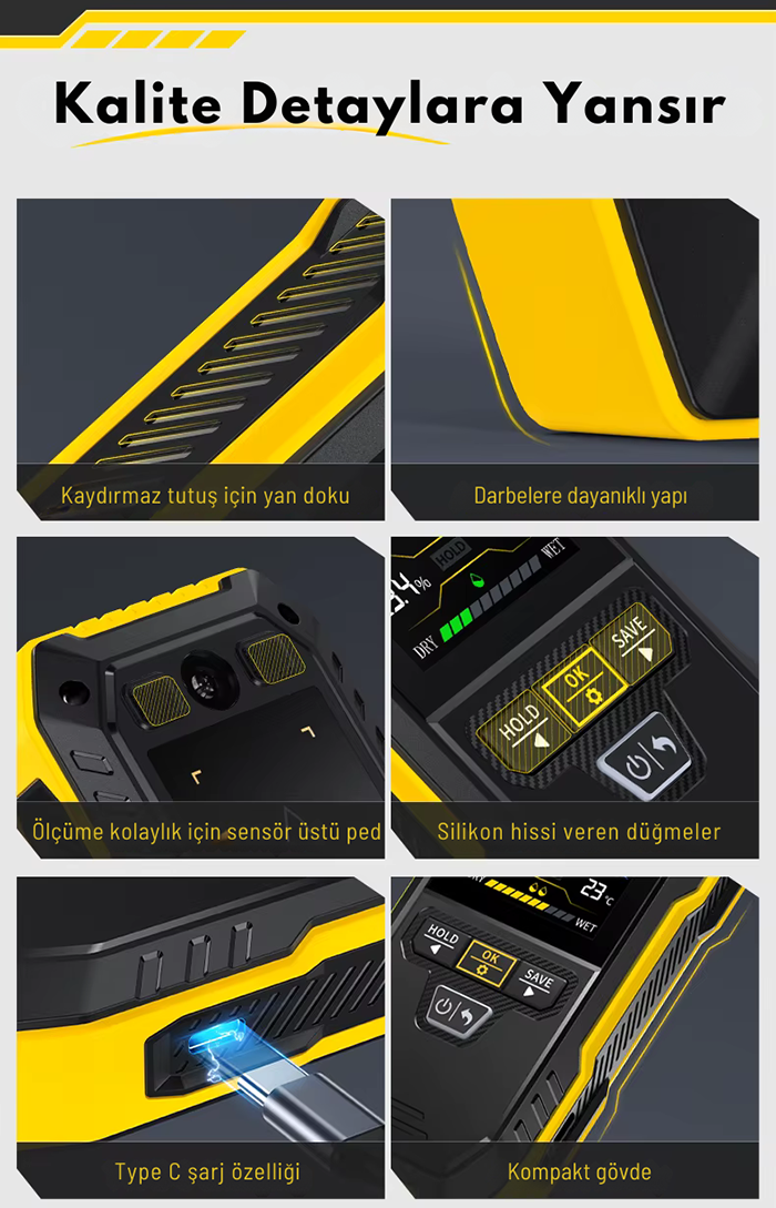 - Sert ağaç (Hardwood), yumuşak ağaç (Softwood), alçı duvar (Powdered Wall) ve tuğla duvar (Brick Wall) olmak üzere dört farklı ölçüm modu sunarak ahşap ve yapı malzemelerinin nem oranını yüksek hassasiyetle tespit eder.
