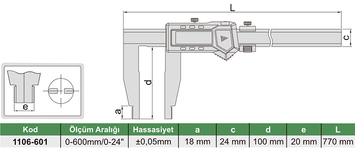 İnsize 1106-601 dijital kumpas, büyük ve uzun parçaların ölçümü için tasarlanmış, tek çeneli (üst çenesiz) dijital kumpastır. 600 mm ölçüm kapasitesi ve uzun gövde yapısı sayesinde standart kumpasların yetersiz kaldığı uygulamalarda güvenilir sonuçlar sunar.