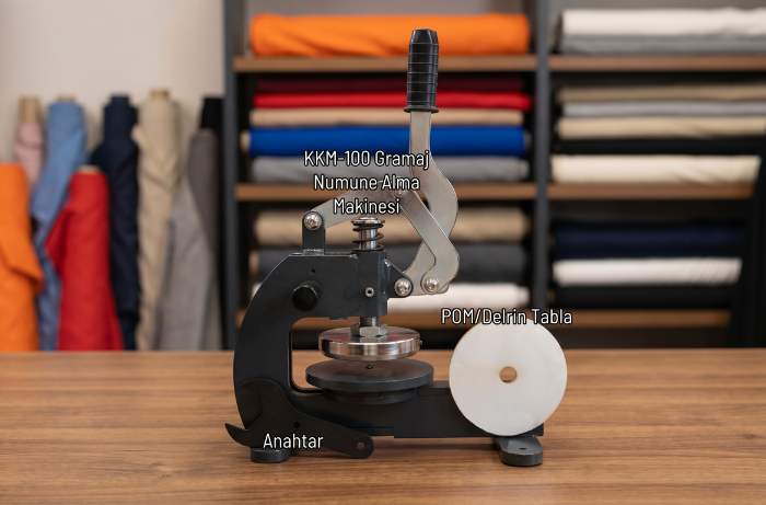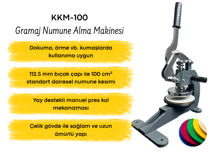 - KKM-100 gramaj numune alma makinesi; dokuma, örme vb. kumaşlarda gramaj kontrolü, kumaş gramaj testi ve standart dairesel numune hazırlama işlemleri için kullanılan, manuel pres mekanizmalı profesyonel bir numune alma makinesidir. Tekstil laboratuvarları ve kalite kontrol uygulamalarında, farklı kumaş türlerinden düzenli ve karşılaştırılabilir numune alınmasına yardımcı olur.