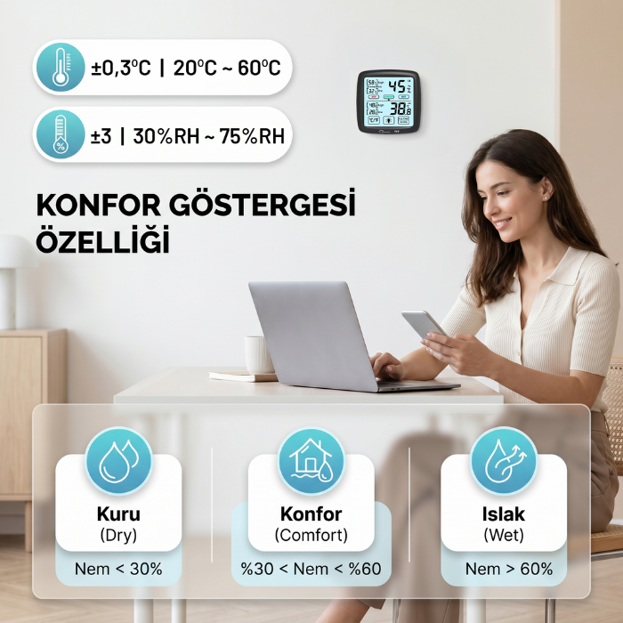 - Cihaz ekranında yer alan bu gösterge; Dry (Kuru), Comfort (Konforlu) ve Wet (Nemli) ibareleri ile kapalı alan hava koşullarının insan yaşamı açısından genel konfor seviyesini pratik ve anlaşılır bir şekilde ifade eder.