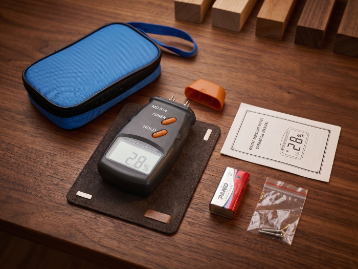 MD 814 ahşap, tahta ve ahşap benzeri nem ölçerin paket içeriği; MD 814 ahşap nem ölçer, 2 adet yedek pin, kullanım kılavuzu, mavi renk taşıma çantası,1 adet 9V pil