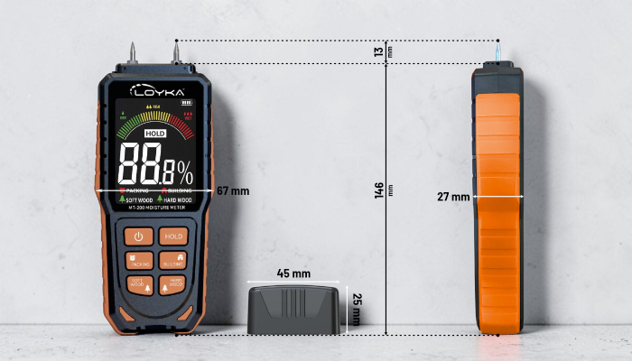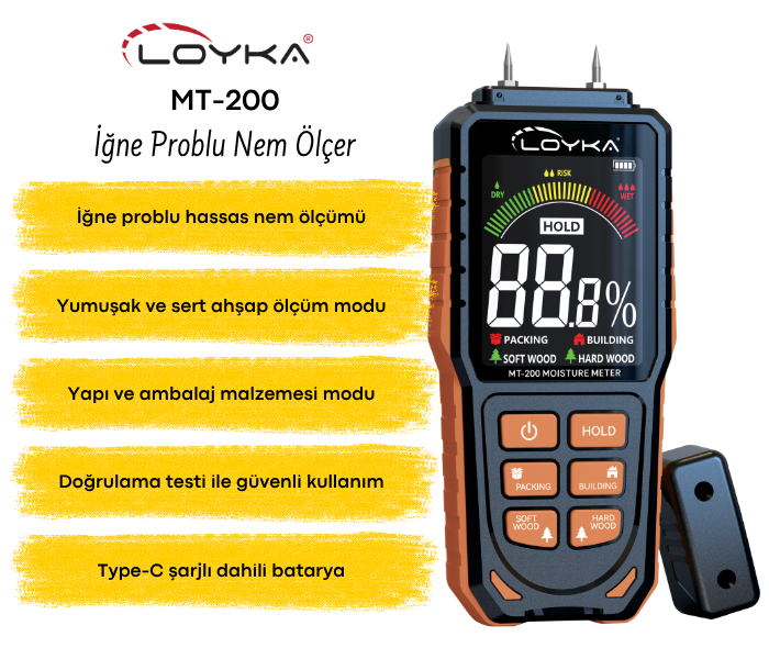 MT-200 iğne problu nem ölçer, ahşap, yapı malzemeleri ve ambalaj malzemelerinde nem oranını doğrudan temaslı ve noktasal olarak ölçmeye yardımcı olan iğne problu profesyonel bir nem ölçerdir. Pinsiz modellere kıyasla, ölçüm yapılacak bölgeye iğneleri temas ettirerek seçilen noktadaki nem seviyesini daha kontrollü şekilde kontrol etmeyi destekler. Soft Wood, Hard Wood, Building ve Packing olmak üzere 4 farklı ölçüm modu, sesli ve ışıklı uyarı sistemi, HOLD fonksiyonu ve Type-C şarjlı yapısıyla saha ve atölye kullanımında pratik ve çok yönlü bir çözüm sunar.