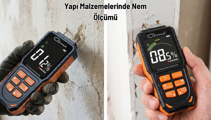 Sıva, alçı, çimento şapı, gaz beton ve benzeri yapı malzemelerinde noktasal nem kontrolü yapılmasına yardımcı olur. Tadilat öncesi kontrol, yüzey kuruluğu takibi ve nem riski tespiti gibi uygulamalarda kullanıma uygundur.