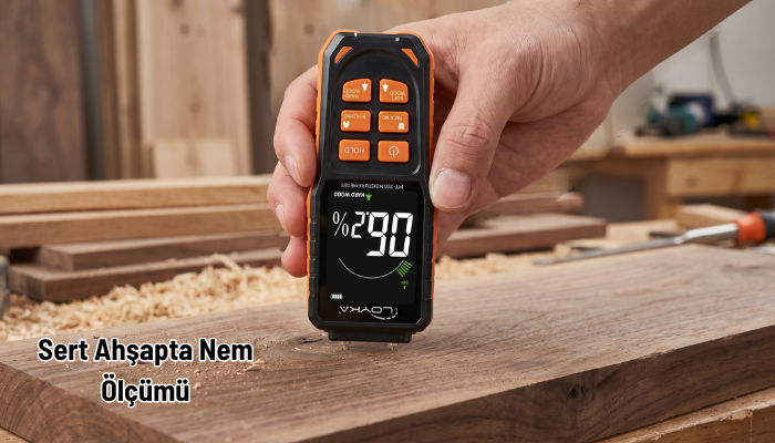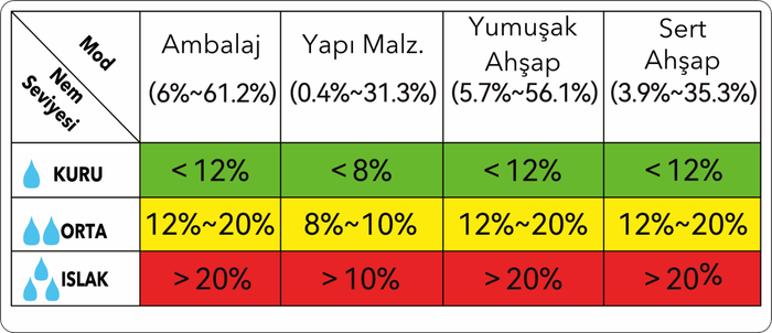 - Ölçüm aralıkları malzeme tipine göre değişmektedir: Ambalaj Malzemesi (Packing) %6–61.2, Yapı Malzemesi (Building) %0.4–31.3, Yumuşak Ahşap (Soft Wood) %5.7–56.1, Sert Ahşap (Hard Wood) %3.9–35.3. Bu yapı, farklı malzemelerde tek sabit aralık yerine daha uygun ölçüm yaklaşımı sunar.
