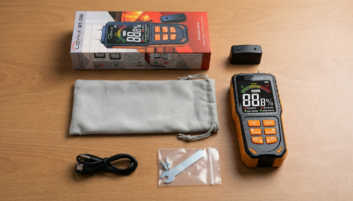 - Kutu içeriğinde 1 adet LOYKA MT-200 iğne problu nem ölçer, 1 adet koruyucu prob kapağı, 1 adet taşıma kesesi, 1 adet USB-A'dan USB-C'ye şarj kablosu, 2 adet yedek iğne prob ve prob değişimi için 1 adet anahtar bulunmaktadır. Türkçe kullanma kılavuzuna kutu arkasındaki QR kodu okutarak ulaşabilirsiniz.