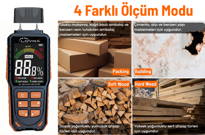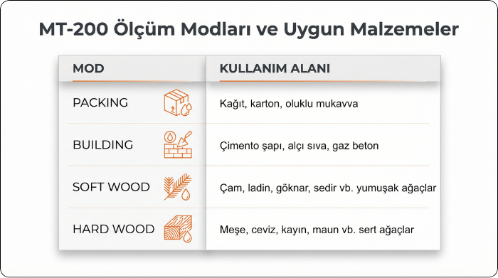 MT-200, farklı malzeme gruplarında daha uygun ve karşılaştırılabilir nem ölçümü yapılabilmesi için 4 ayrı ölçüm modu sunar. Malzeme tipine uygun mod seçimi, ölçüm sonuçlarının daha tutarlı değerlendirilmesine yardımcı olur ve cihazın kullanım alanını genişletir.