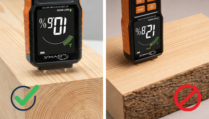 Ahşapta lif yönüne paralel yapılan ölçümler, elektriksel iletkenlik farkı nedeniyle yanıltıcı sonuçlara yol açabilir. Daha tutarlı ve güvenilir ölçüm için problar her zaman lif yönüne dik olacak şekilde uygulanmalıdır.
