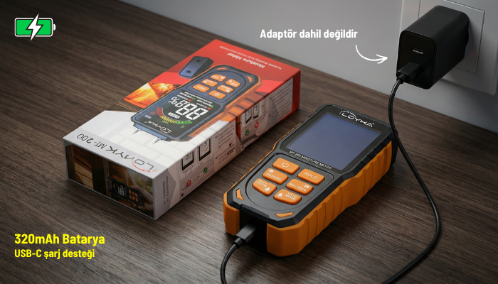 - 320 mAh dahili lityum batarya ile çalışır ve Type-C bağlantı üzerinden şarj edilir. Tek kullanımlık pil ihtiyacını azaltan bu yapı, saha ve atölye kullanımında daha pratik enerji yönetimi sunar. Düşük pil göstergesi sayesinde şarj ihtiyacı önceden fark edilebilir.