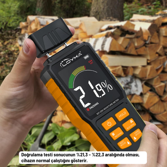 MT-200, ölçüm öncesinde cihaz durumunu hızlıca kontrol etmeye yardımcı olan pratik bir doğrulama testi özelliğine sahiptir. Cihaz PACKING moduna alındığında, problar koruyucu kapağın üst kısmındaki test deliklerine yerleştirilerek referans değer kontrolü yapılabilir. Ekranda görülen sonucun %21,3 – %22,3 aralığında olması, cihazın normal çalıştığını ve ölçüme hazır olduğunu gösterir. Sonuç bu aralığın dışında kalıyorsa, cihaz üzerinden manuel kalibrasyon işlemi uygulanarak ölçüm doğruluğu yeniden ayarlanabilir.