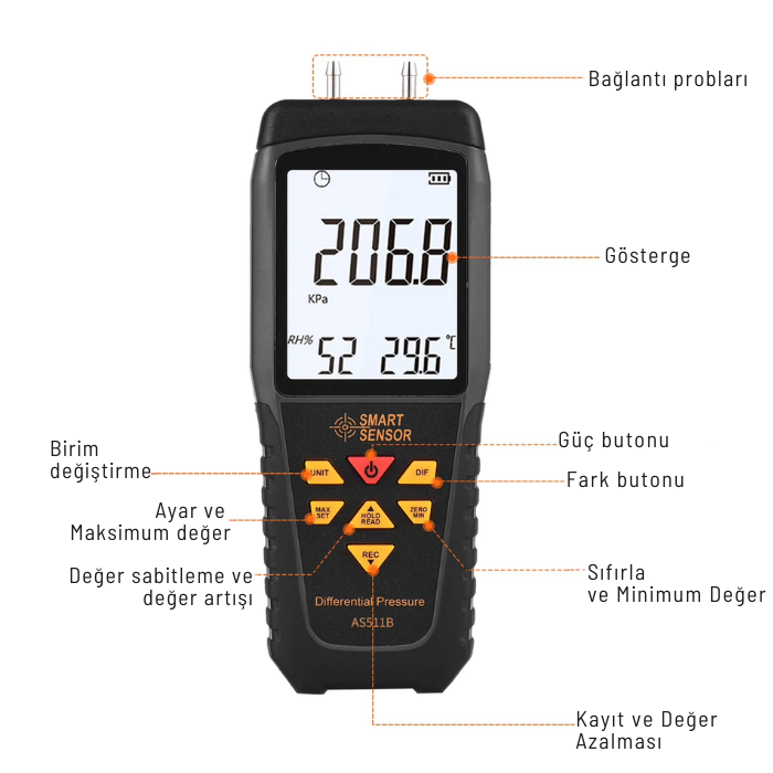Smart Sensor AS511B; iki nokta arasındaki basınç farkını negatif ve pozitif yönde 2068 mbar'a kadar ölçebilen hassas bir manometredir.