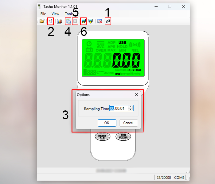 1- Cihaz USB ile bilgisayara bağlanır ve program açılır. Otomatik olarak bağlantı olmadıysa 1 numaradan cihaz ile bağlantı yapılır.