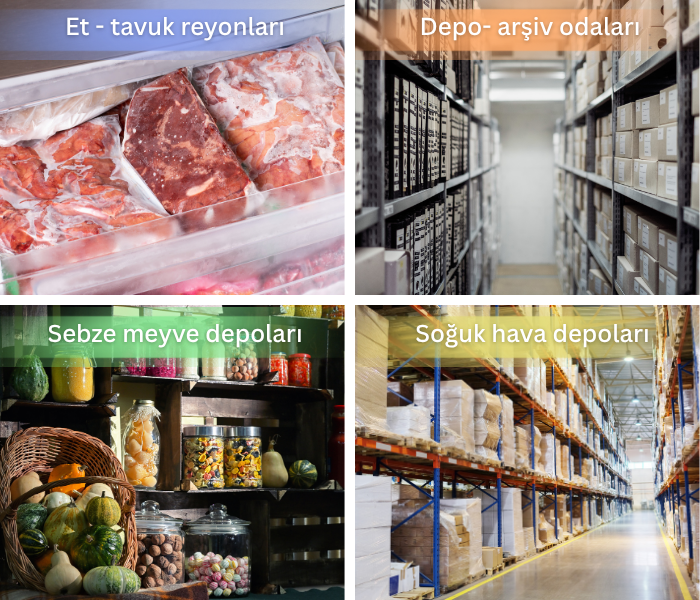 - Gıda üretim tesisleri, ilaç ve eczane depoları, laboratuvarlar, soğuk hava depoları, buzdolapları, sevkiyat kutuları ve lojistik operasyonları gibi sıcaklık kontrolünün kritik olduğu pek çok alanda güvenle kullanılabilir.
