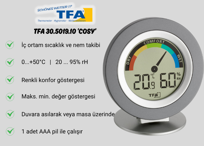 TFA Cosy 30.5019.10 oda sıcaklık nem ölçer; ortam sıcaklık ve nemini ölçen fakat diğer termometrelerden farklı olarak şık bir göstergeye sahip olan bir cihazdır.