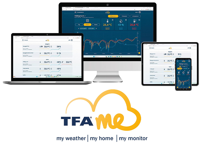 - TFA.me portalı üzerinden bir bakışta tüm sensörleri görüntüleyebilir, sensör bazlı limit değerler belirleyebilir ve günlük, haftalık veya aylık ölçüm raporlarını tablo veya grafik formatında indirebilirsiniz. Sistem aynı zamanda 50 adede kadar TFA-ID sensörünü destekler, bu sayede yapı büyüdükçe izleme altyapınızı kolayca genişletebilirsiniz. Ayrıca tüm ölçüm geçmişi sistemde en az 12 ay süreyle güvenli şekilde saklanır.