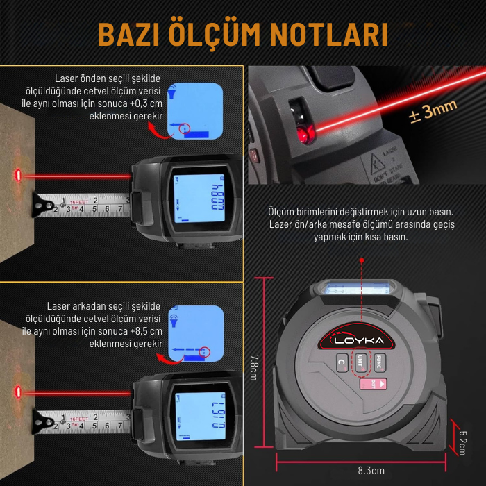 - Lazerli mesafe ölçümünde 40 metreye kadar, şerit metre ile ölçümde ise 5 metreye kadar mesafe ölçümü yapılabilmektedir.